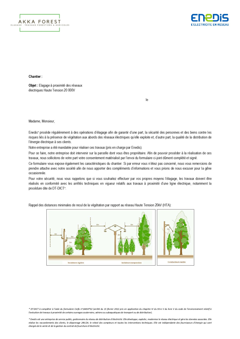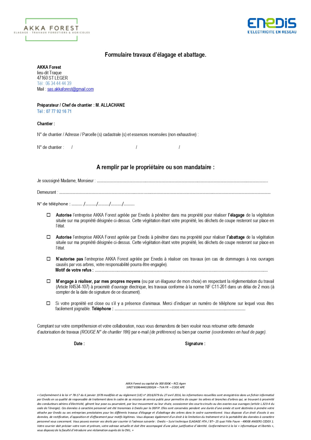 L'entreprise AKKA FOREST est mandatée par ENEDIS Lot-et-Garonne, afin de réaliser des travaux d’élagage à proximité des lignes électriques.Ces travaux ont pour objectif d’améliorer la sécurité ainsi que la qualité de la fourniture d’électricité pour vos administrés.